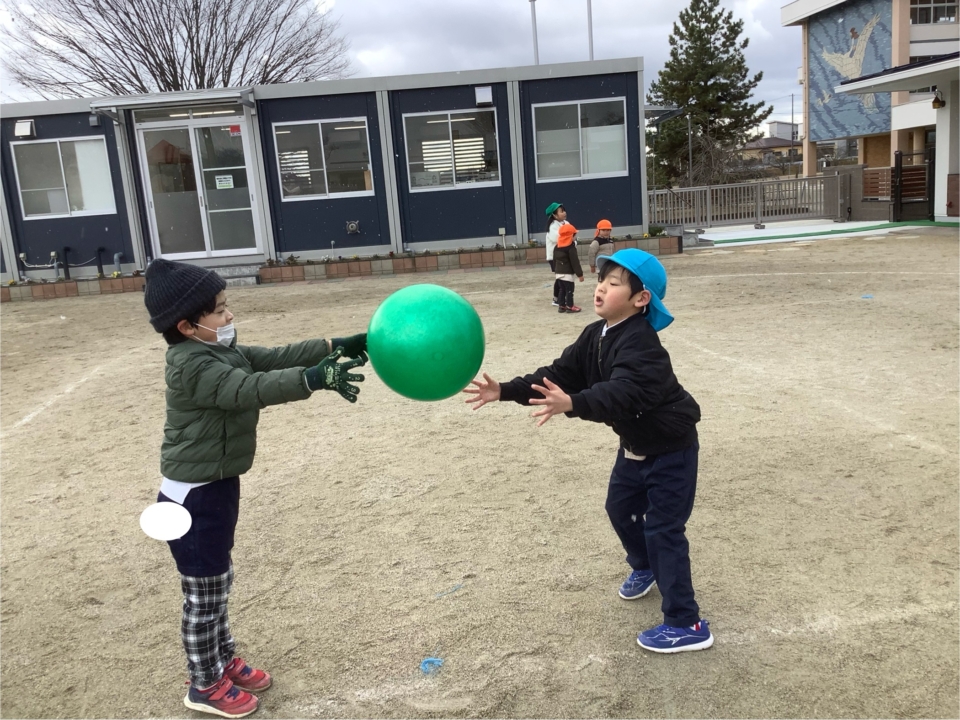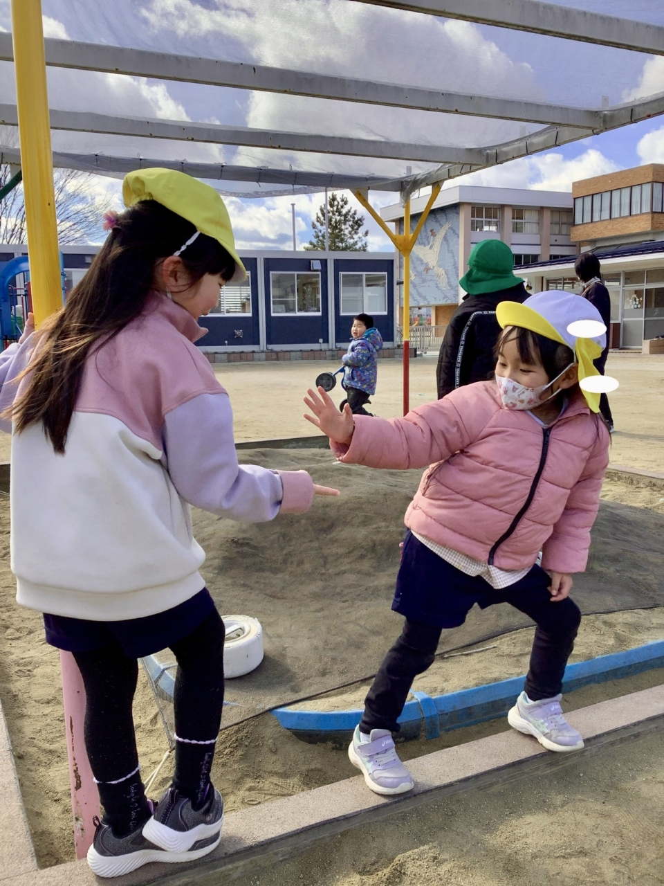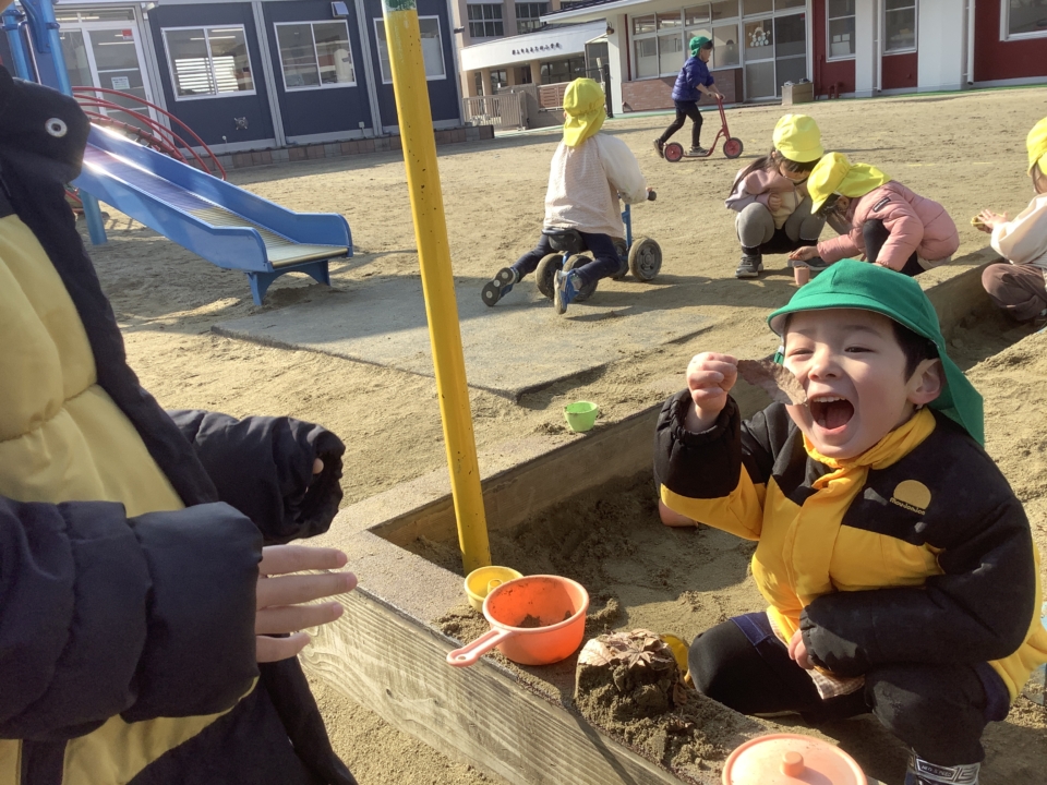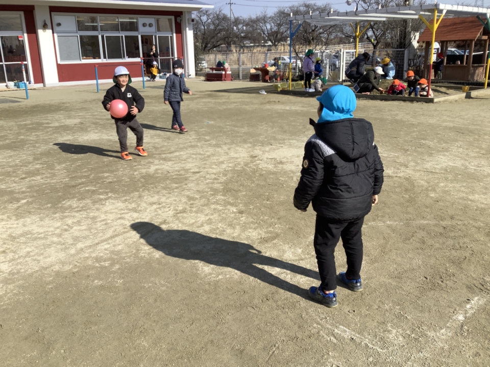 風が冷たい中でも、子どもたちは元気いっぱい戸外で遊んでいます!!
