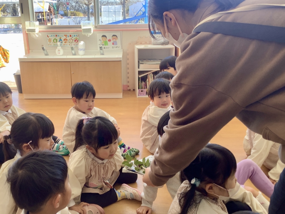また、園に飾った柊の葉っぱを触ったり、いわしの頭の匂いを嗅いだりしました。