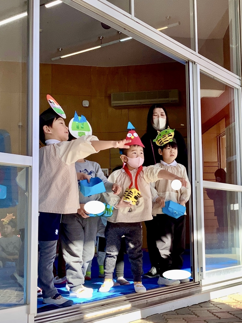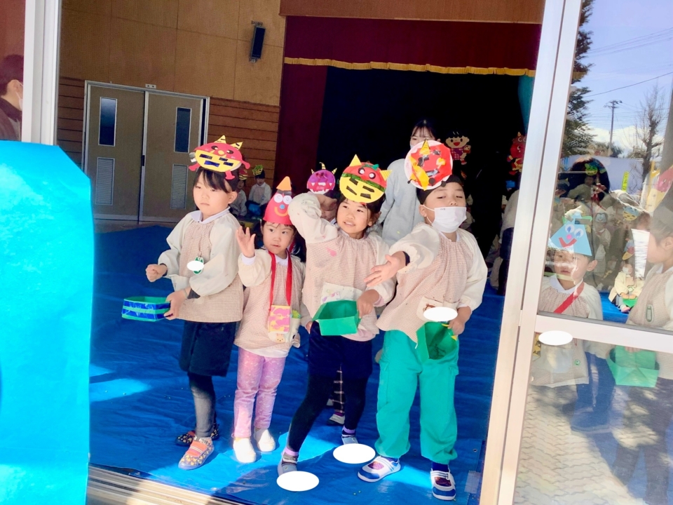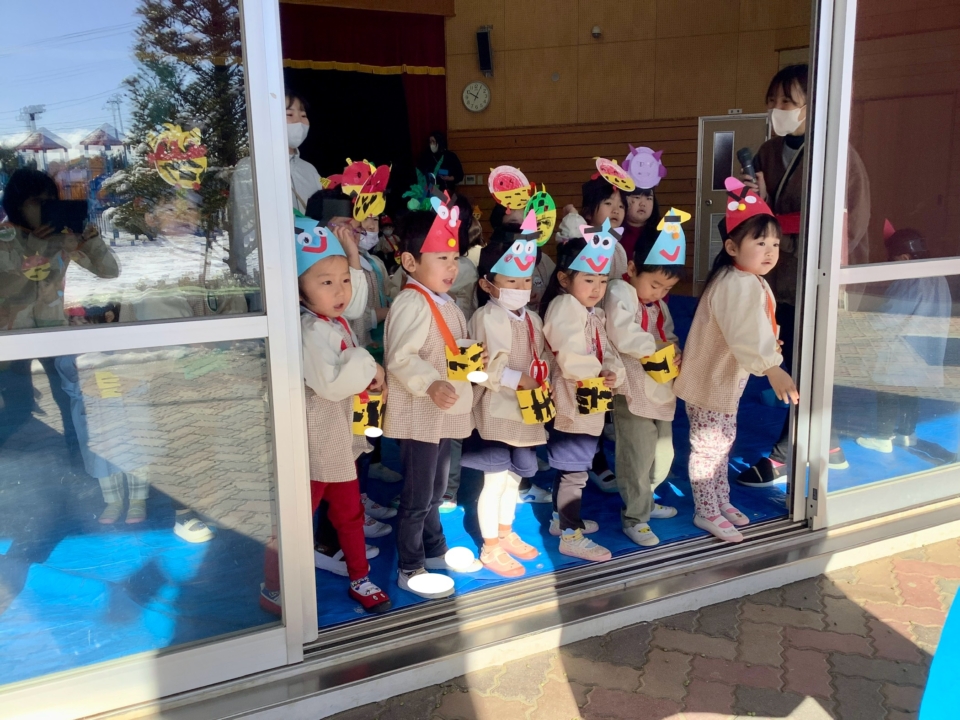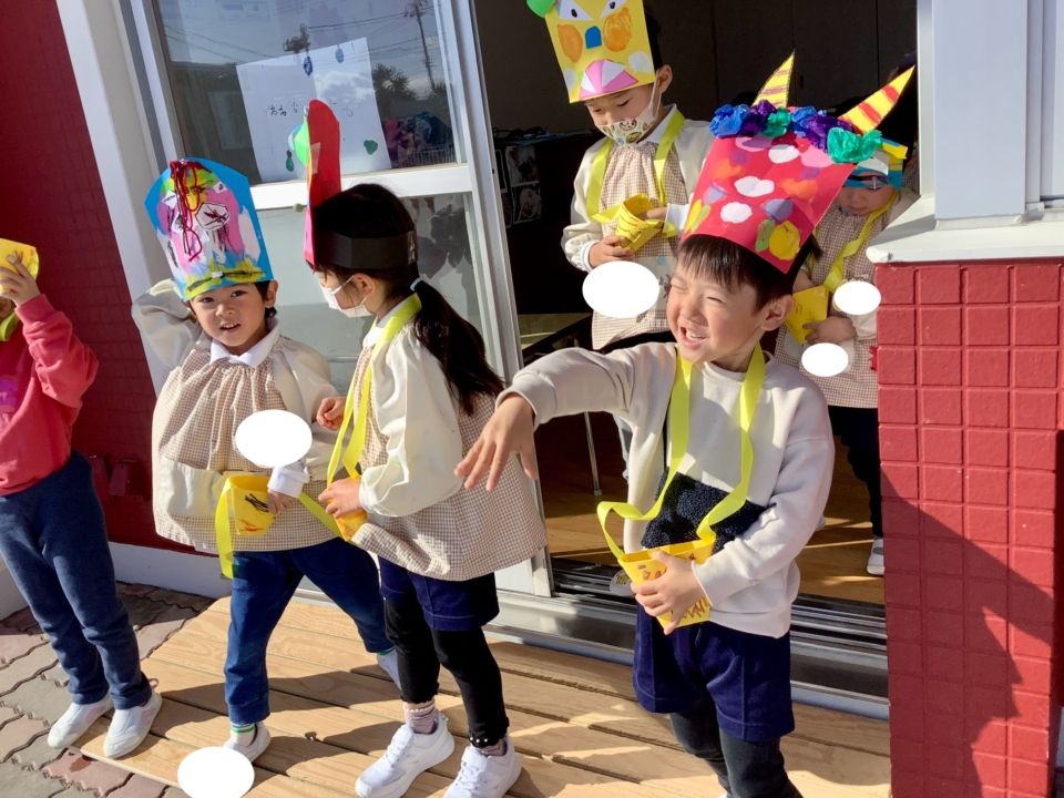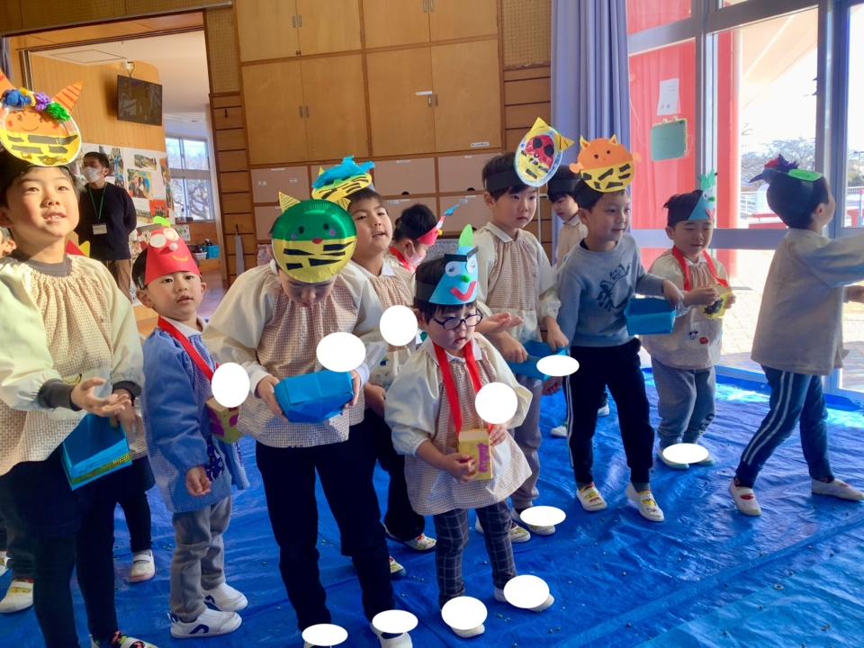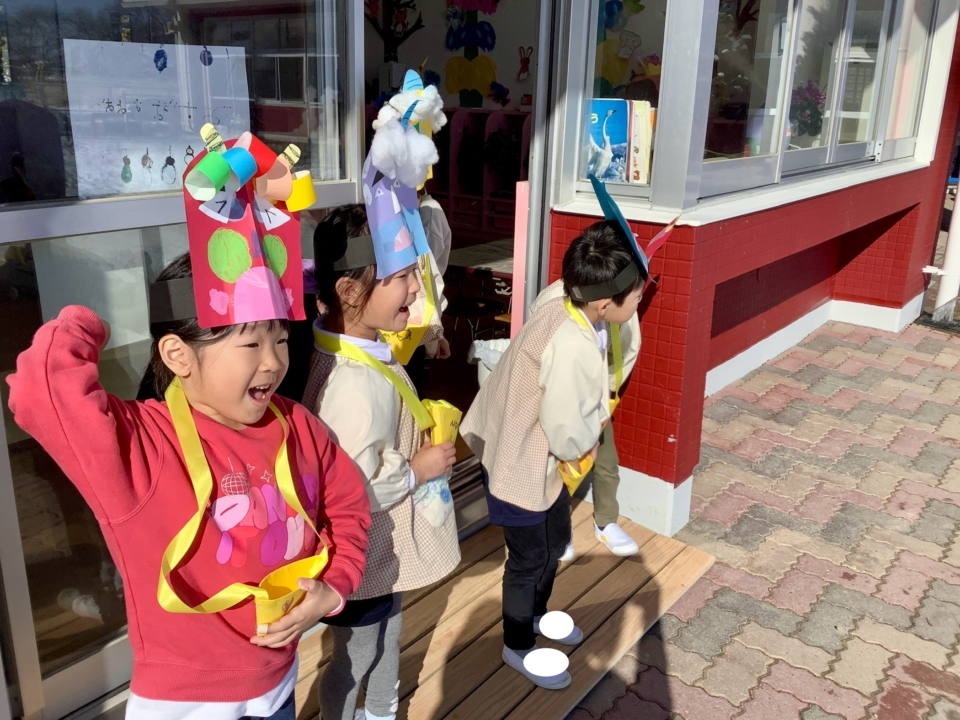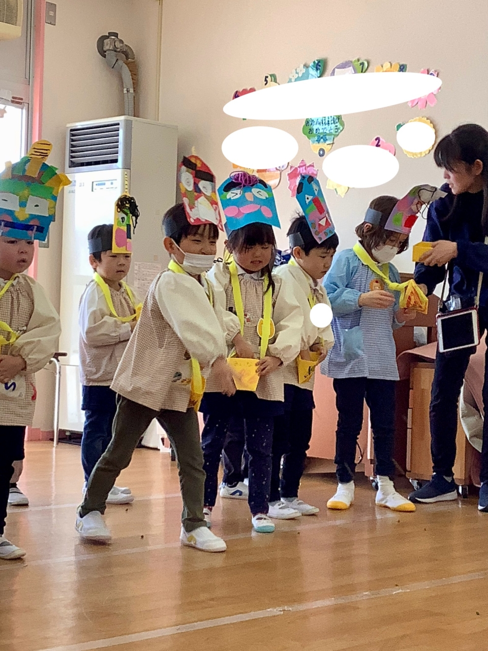 年少児と年長児は、遊戯室で一緒に豆まき!!