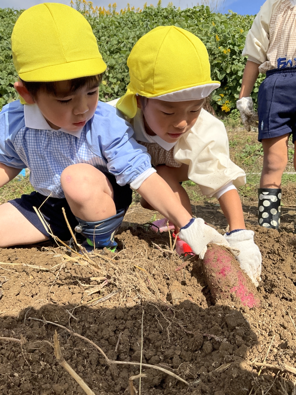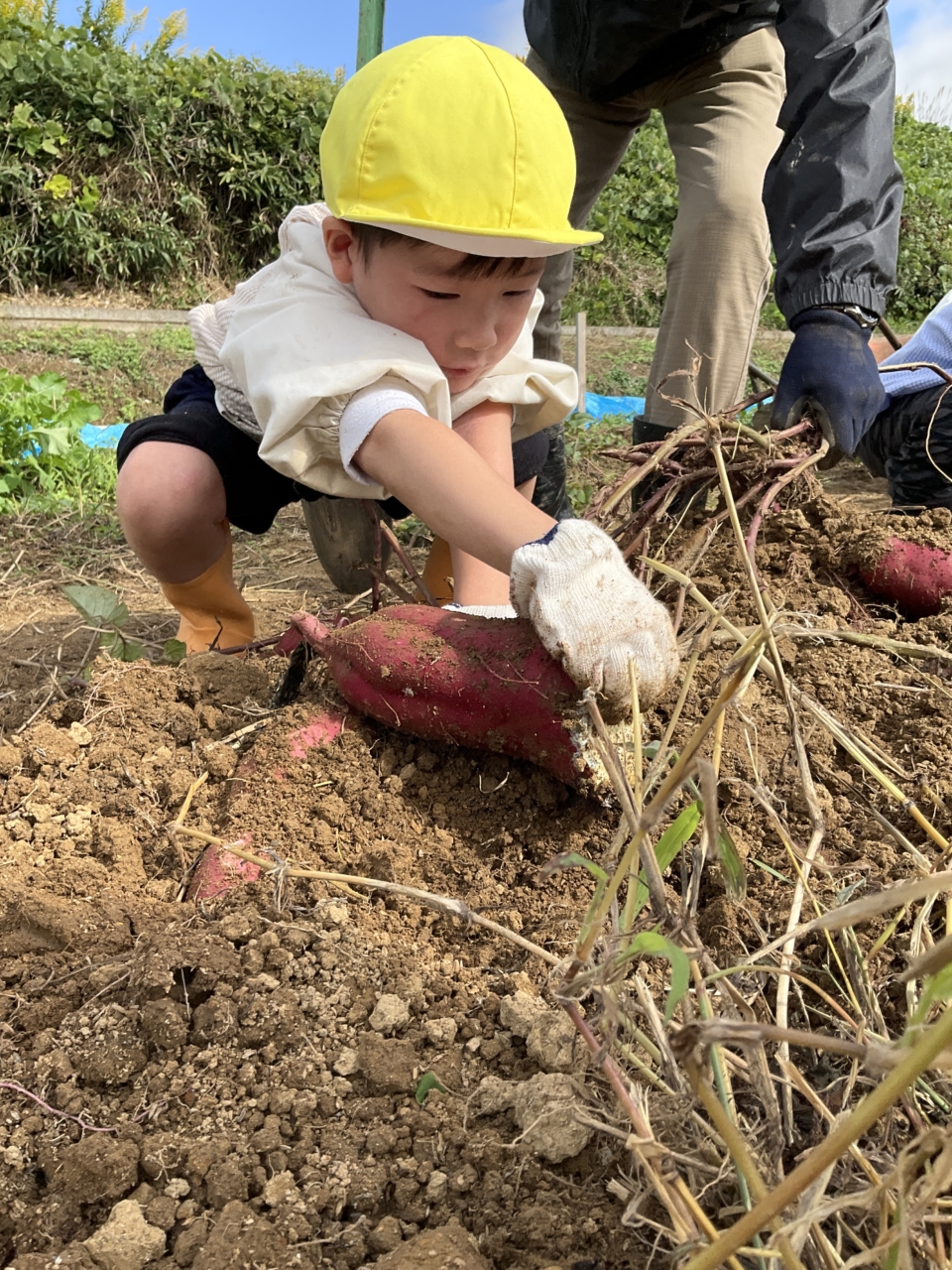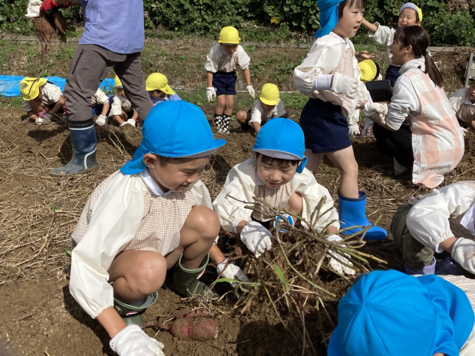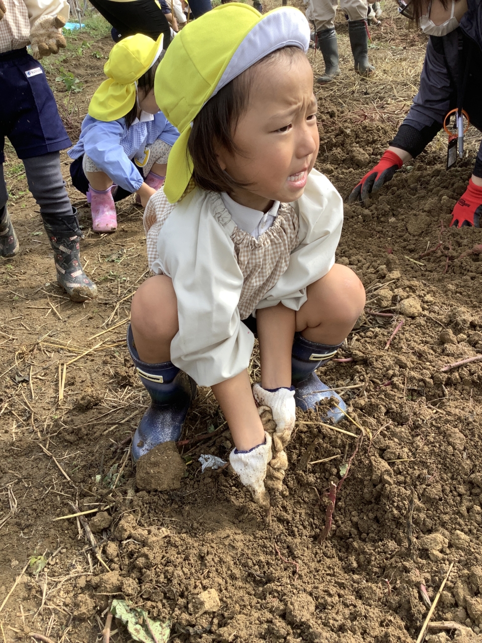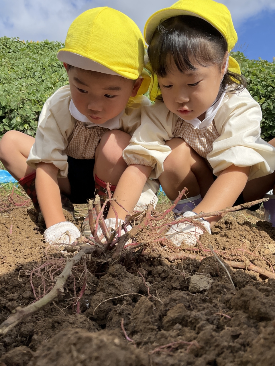 年少児は園庭のさつまいも畑にてさつまいも掘りを行いましたよ!