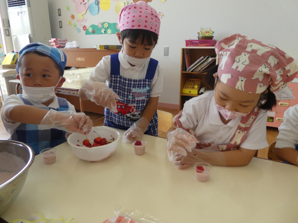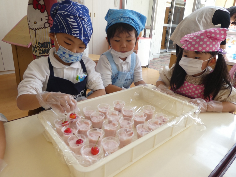 牛乳と混ぜてカップに分け、さくらんぼをトッピング♪