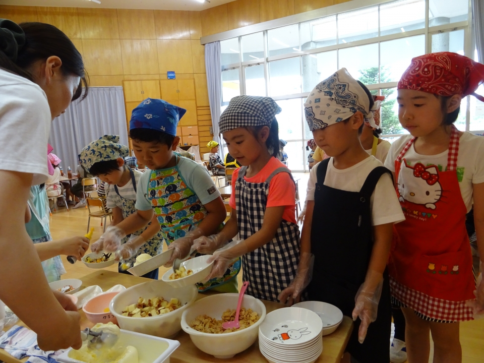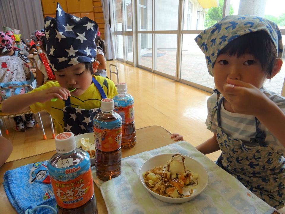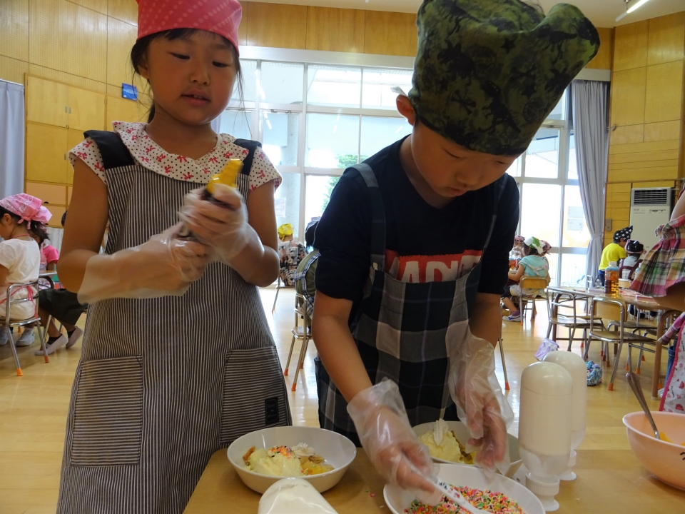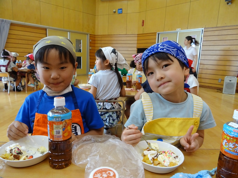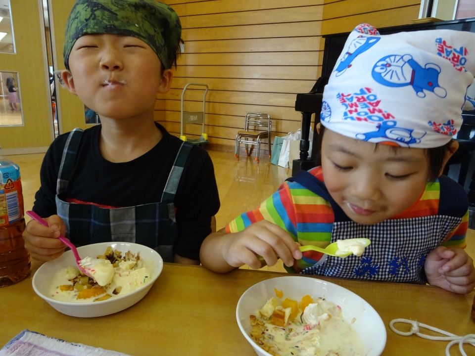 外でリレーを楽しんだ後は、パフェを作りました♪