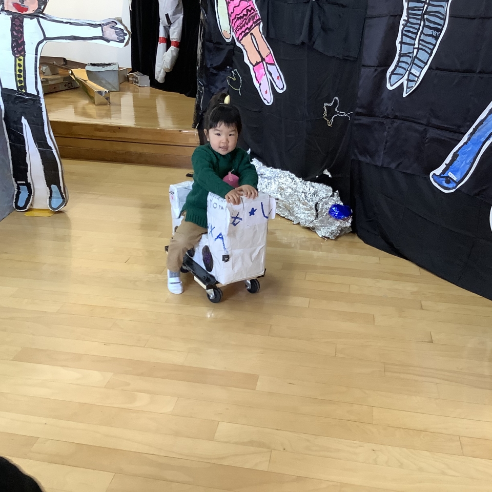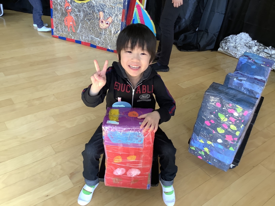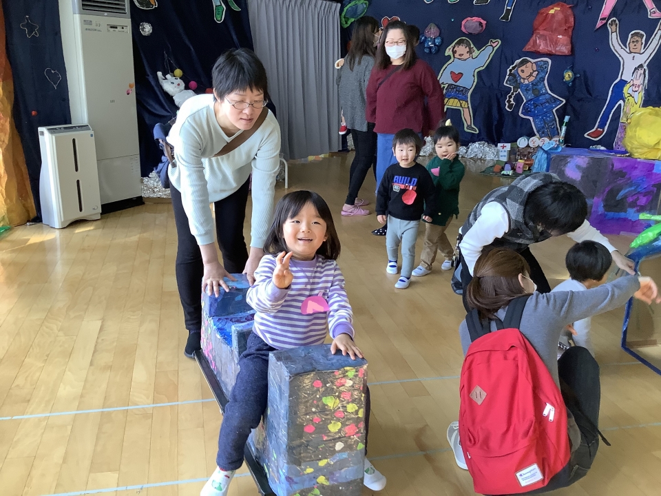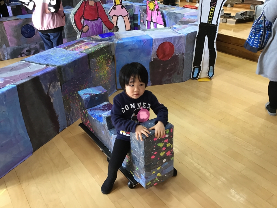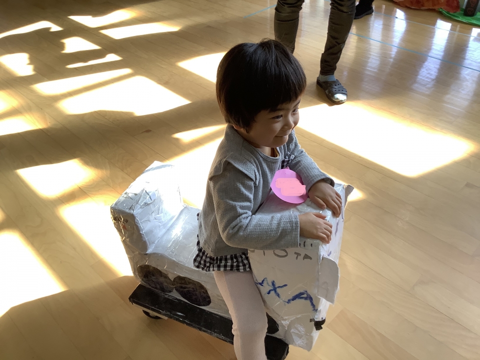 年長児が作品展で作ったトンネルや車で遊びました(^O^)/