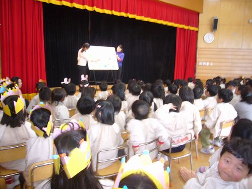 先生たちが「おたのしみ」として、「動物さんがみらい幼稚園に遊びに来たよ」のパネルシアターをやってくれました。