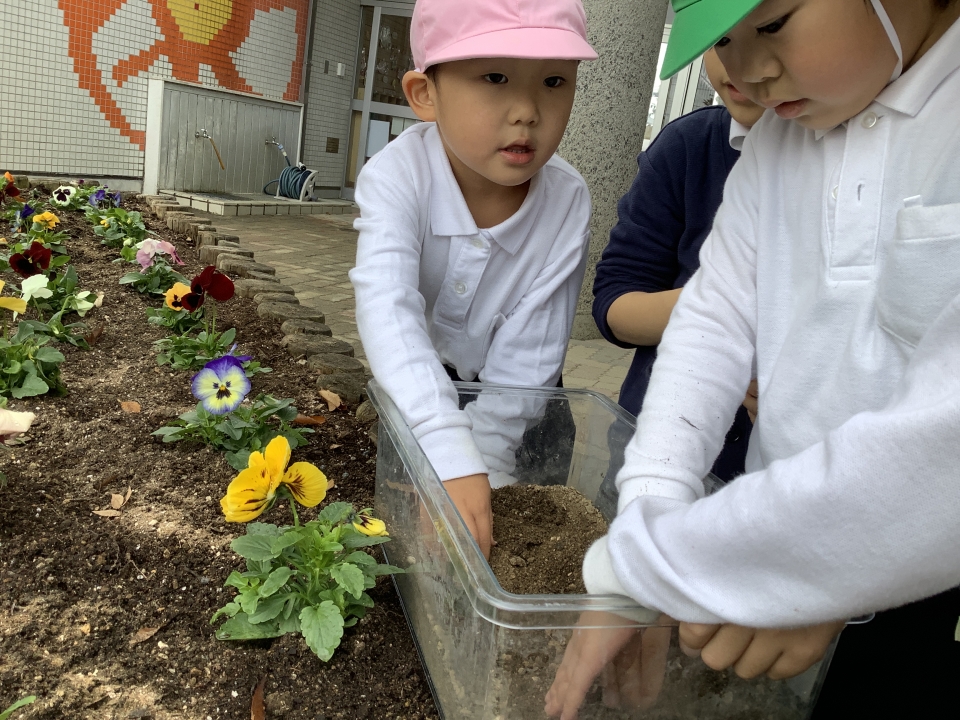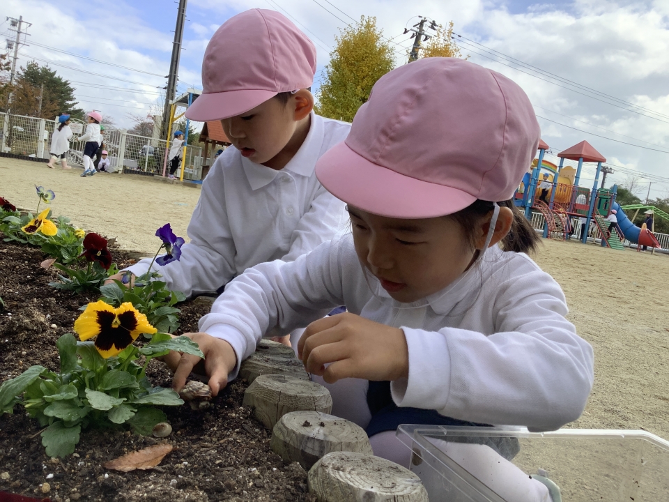 クラスで飼育していたカタツムリ・・・土の中でゆっくり冬眠できるように花壇に逃がしてあげました。