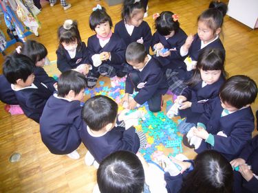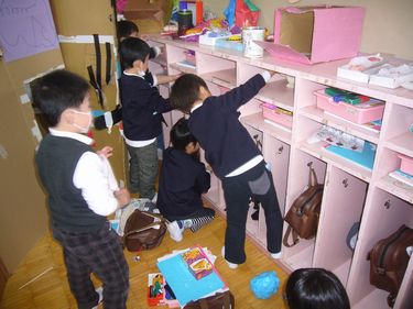 みんなで協力して、ロッカー、椅子、ブロックなどをきれいに掃除しました。