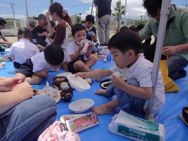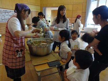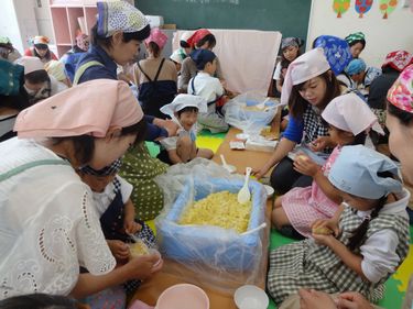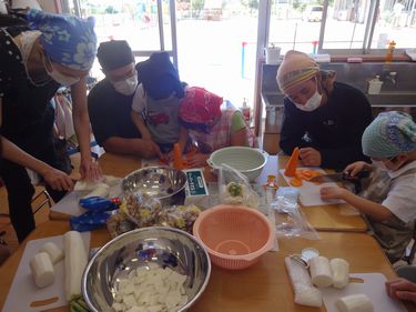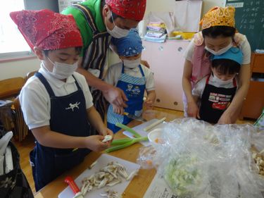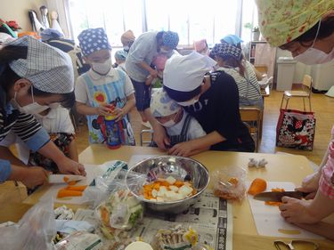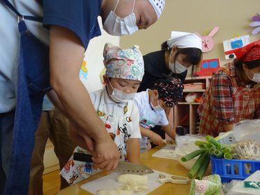 年長組 包丁を使って野菜を切り、豚汁を作りました。