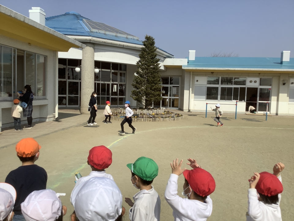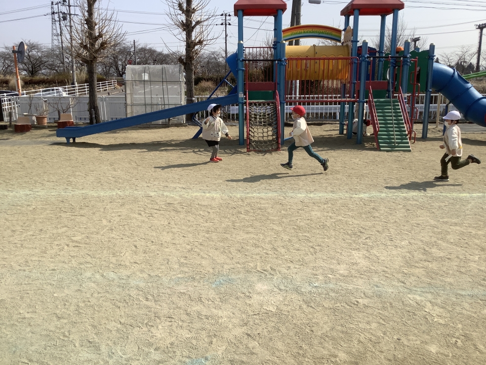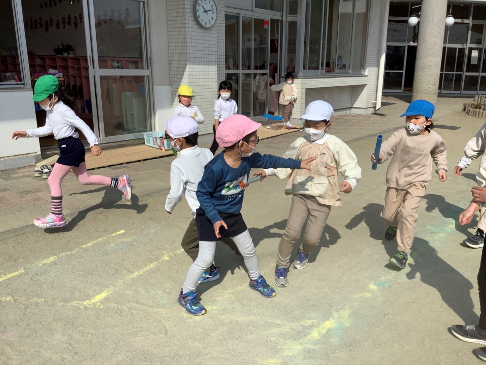 外では、年長、年中、年少のみんなでリレーを楽しんでいますよ♪