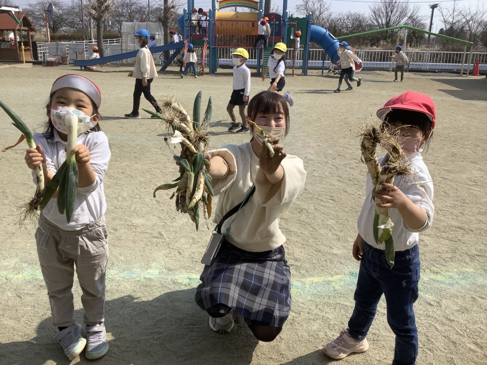 園庭の端にネギを発見!!年少児が収穫しました(^_-)-☆